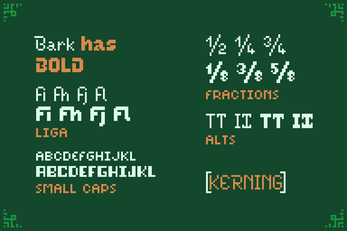 Bark is a pixel-perfect font that stands just 8 pixels tall, available in regular and bold weights. It’s designed for long-form reading and pixel art comics, offering high readability while keeping a compact footprint.